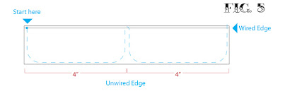 - Rethread your needle with a 14” piece of thread and knot it off. Using the 8” ribbon, sew two U-gather stitch sections in 4” intervals. You want to start your stitches at the top with the wire so that the bulk of the gathered stitches are on the unwired edge. See fig 5.