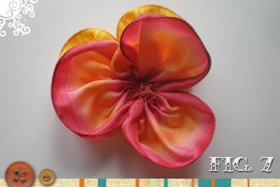 - Sew the three petal section on top of the two petal section. Stitch in the center only and try to hide the stitches in the folds. Put aside while you make the center.