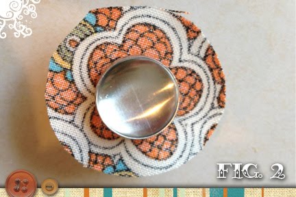 - With the wrong side up, center the fabric in the button tool and place the top button shell over top of the fabric (convex side down). Push the metal piece down into the button tool.